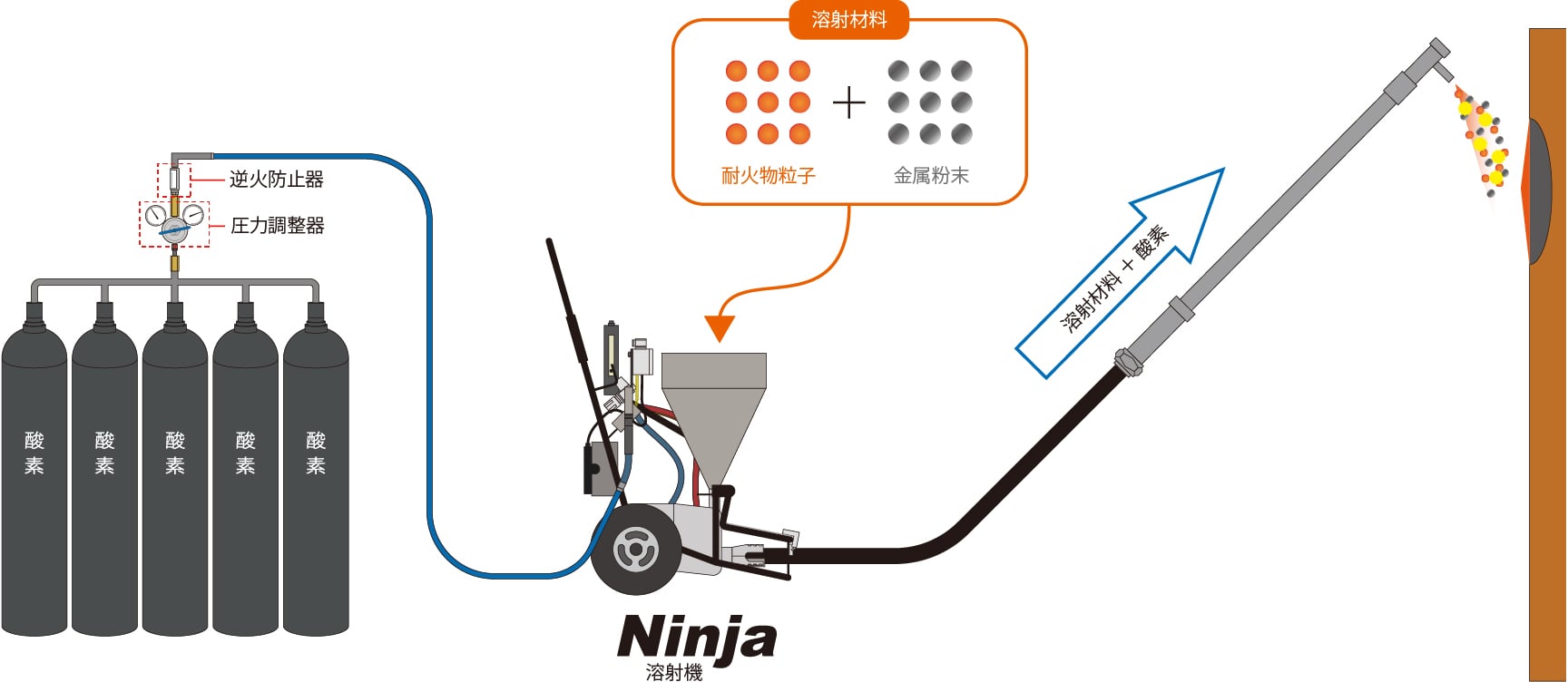 炉内煉瓦欠損部などの溶射補修(遠隔作動可能なRCタイプもあり) |